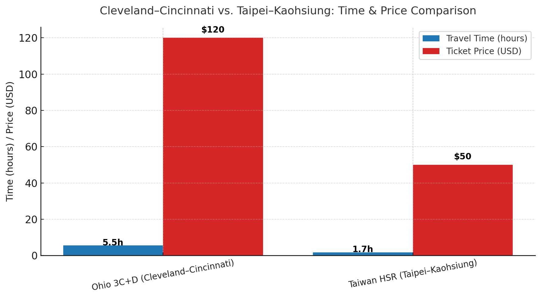 Economic impacts. Advocacy-commissioned studies (Scioto Analysis; All Aboard Ohio) project ~$100M+ statewide impact and ~1,100 construction jobs for a 3C+D buildout. That’s plausible and encouraging—but it doesn’t change the core product we’re buying if we stay conventional-speed. WOSU Public Media+2Scioto Analysis+2