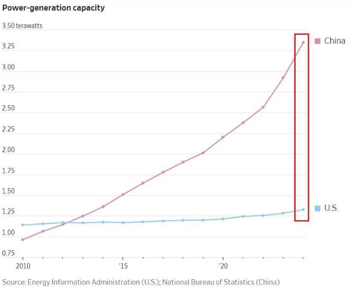 The U.S. has added capacity, yes, but our total generation has been relatively flat for a long time compared to the scale of what is coming. China is building generation, transmission, and industrial capacity like it expects to win the next century.