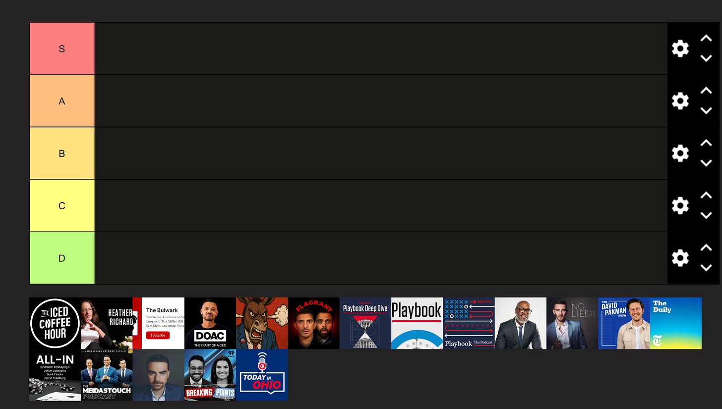 I pulled up the political outlets and personalities I read, watch, and listen to. I literally grabbed their thumbnails, dropped them into the program, I linked below, and forced myself to grade them using the checklist. Not based on whether I agree with them, as I listen to plenty of people I do not agree with, but based on trust, incentives, transparency, ownership, consistency, and whether I clearly understand what they get out of me believing what they are saying.