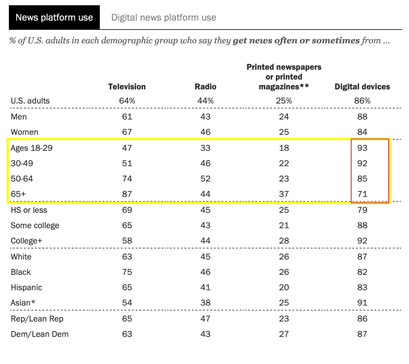 At the same time, 93 percent of 18 to 29 year olds consume news on digital devices, compared with 71 percent of those 65 and older. That means tens of millions of younger Americans are operating in a primarily digital news environment, while older Americans remain anchored in broadcast.